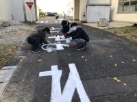 マイムマイムを踊った後は、ファイヤー実行委員の進行で、猛獣狩りというゲームをしました。進行係の声に合わせ、全員が円状に移動(写真1)し、係が言った動物の名前の文字数のグループ(ライオンならば、4人グループ)を作って、できたら座る(写真2)というゲームです。グループを作れなかった人は、元気に自分の名前を言っていきました。(写真3)このゲームでも、盛り上がっていました。