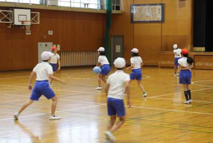 体育館全面でボール鬼ごっこをしていました。全員が動き回り,