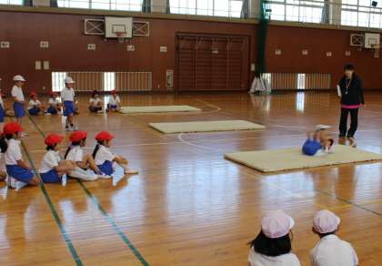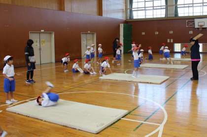 また,上手に前転できる子どもが,お手本として披露する場面もあり