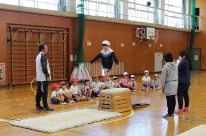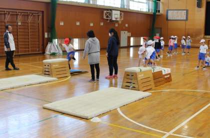 する」運動と,高さの違う跳び箱を3つ並べて「跳び箱の上を這って