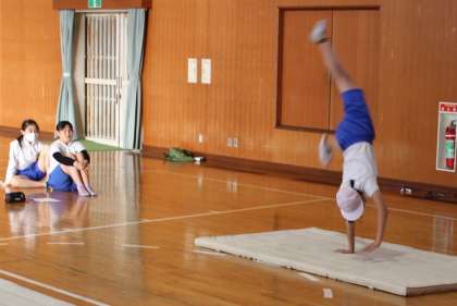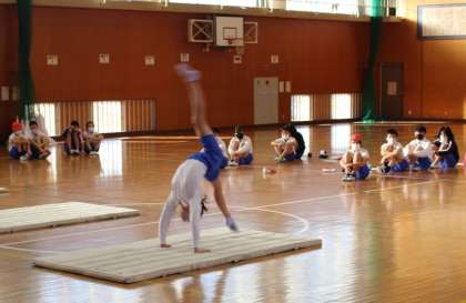 ※一人がマットを2往復して,4つの種目を披露していました。一人の演技が終わると,全員が拍手をして,次の人が演技をしていくという形で進められていました。