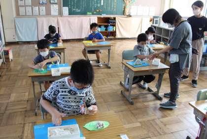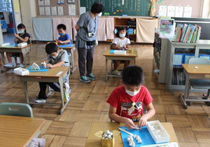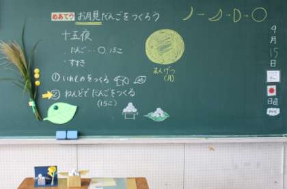 うのはな学級・くすのき学級・ぶどう学級では,なかよしタイムの授業で「お月見だんご」を作りました。子どもたちは,先生から示されたお手本【写真1】を参考にして,油粘土で「お団子」を作って色紙の容器に入れたり,色紙の葉の上に飾ったりしていました。また,「うさぎ」など,お月見に関係するものを作るようすも見られました。(各自がよく考えながら,とても集中して取り組んでいました)