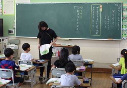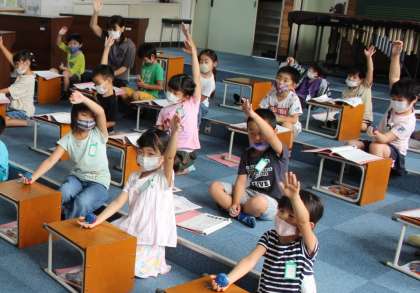 ※「かすたねっとの うた」や「おもちゃのチャチャチャ」など,1学期に習った楽曲を中心に,カスタネットのリズム打ちをしていました。先生のピアノ伴奏に合わせて,楽しそうに活動していました。