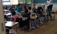 ※前回の授業で行った実験結果を整理して,グループの子どもたち同士で「音の大きさと振動(糸電話の震え方)」について意見交換をしていました。