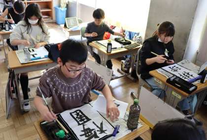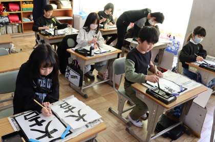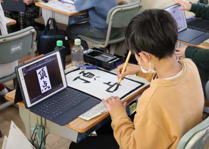 4年生は、書写(毛筆)の学習で、自由作品を書きました。各自が書きたい字(好きな言葉など)を決めて、それぞれ練習していました。(タブレット端末で書体を調べ、その字をお手本にして練習する姿も見られました)