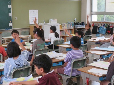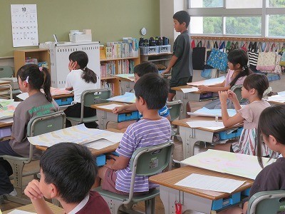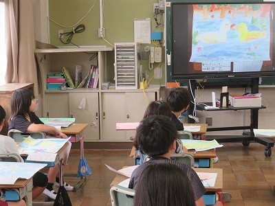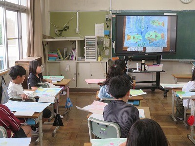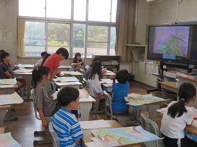 「題と絵がぴったり合っているでしょう!」「表情や動き、景色が工夫されているでしょう!」「「色ぬりが工夫されているでしょう!」などの視点で友達の作品を鑑賞しました。
