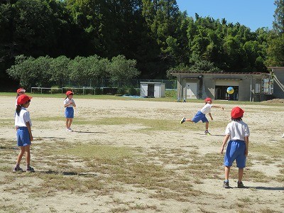 「○○さん、いくよ」と声をかけながら、キャッチボールをしました。