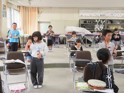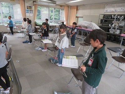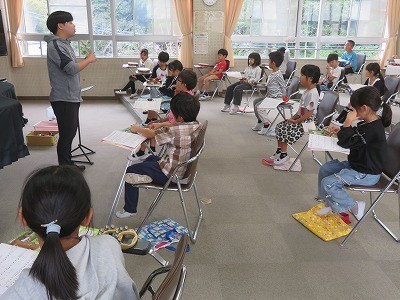「森のたんけんたい」を歌ったり、楽器で演奏したりしました。