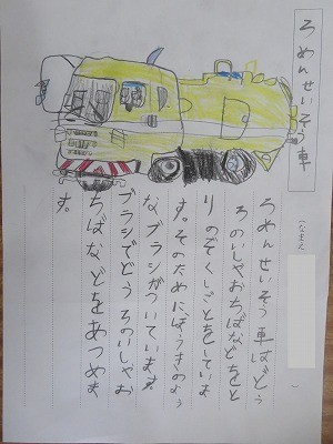 本を読んで、自分の調べたい車のことを絵と文でまとめています。