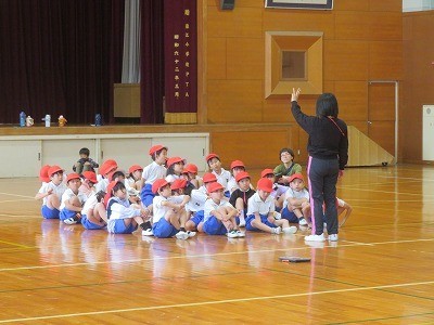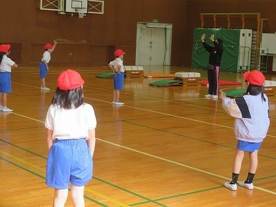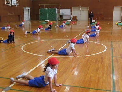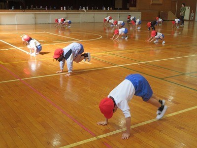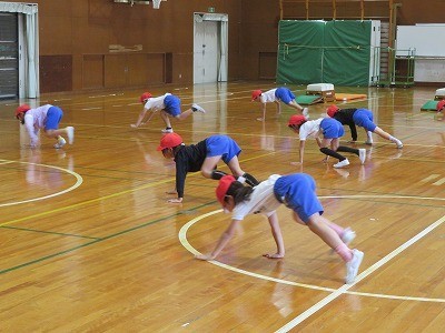 「馬歩き」「アザラシ歩き」「ウサギ歩き」などをしながら、跳び箱に必要な部分をほぐしました。