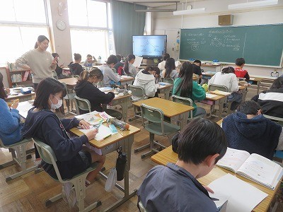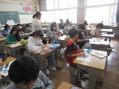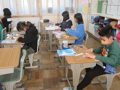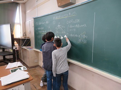 先生から示された三角形の3倍の拡大図をかいて、切り、それを友だち同士で比べていました。