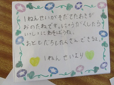 夏に育てたアサガオの種を来年の1年生にプレゼントをするそうです。