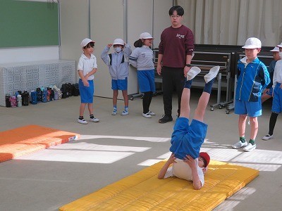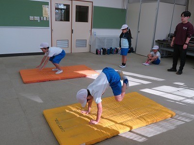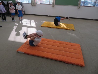 「カエルの足うち」「後転」「前転」などみんな上手に行っています。