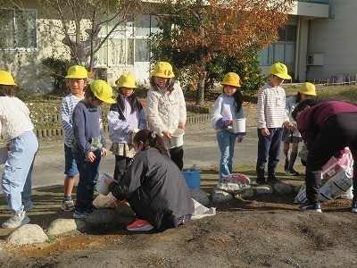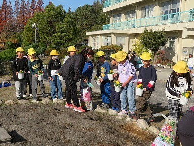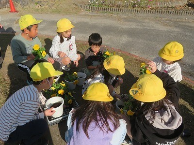 2年生が一人一鉢活動でパンジーの苗を鉢に植えていました。
