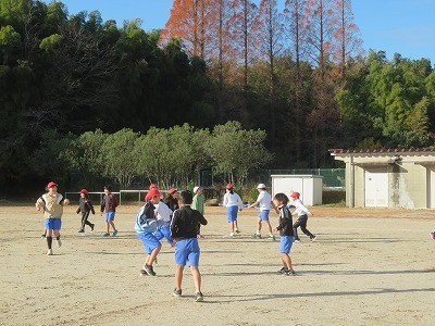 4年生が体育で三色鬼ごっこをしていました。