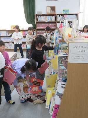 1年生が図書館で冬休み用の本を借りていました。