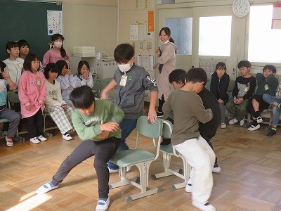 椅子取りゲームで、だんだん椅子が少なくなってくると、見ている子どもたちもドキドキはらはらです。