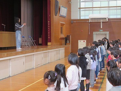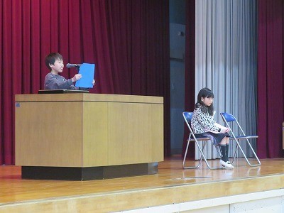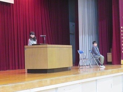 児童代表の話・・・2年生と6年生の代表児童が2学期にがんばったことを話してくれました。
