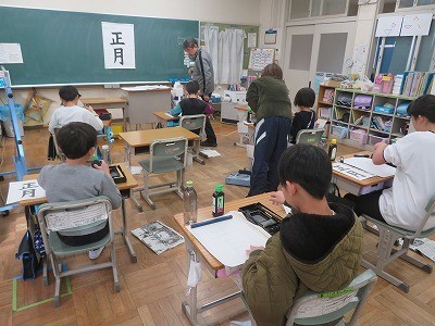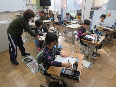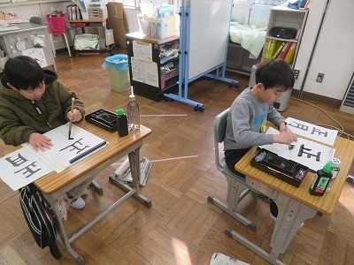 「とめ」「はらい」に気をつけながら、お手本をよく見て書いています。