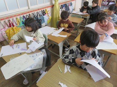 表現したい物の形を切って、画用紙に貼っています。