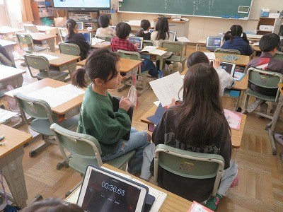 決められた時間で分かりやすく発表できるように、タイマーで時間を計りながら練習をしています。