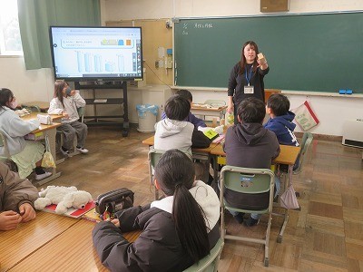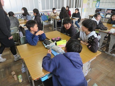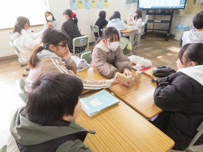 5種類の積み木から1つを選び、その特徴を伝えて、どの積み木のことを言っているかをあてるゲームを行っています。