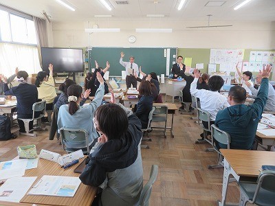 町内の他の小中学校の先生たちも一緒に先生たちも楽しく勉強しています。