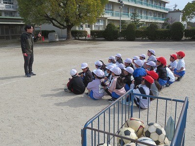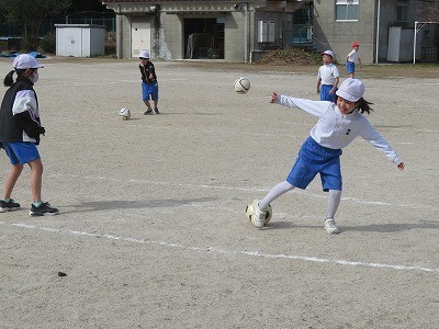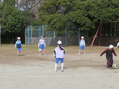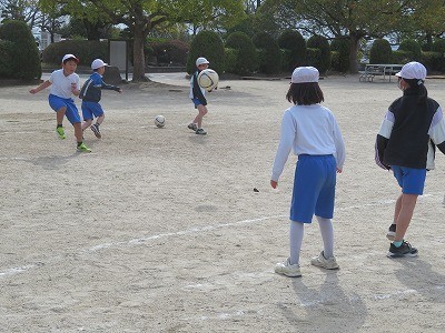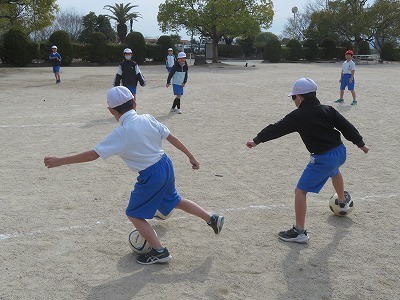 2年生が体育でボール蹴りゲームに取り組んでいます。