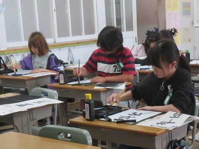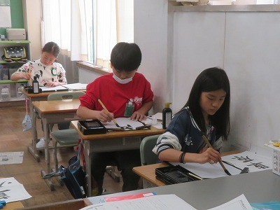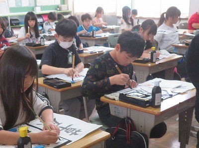 5年生は、書写「文字の組み立て方」の学習をしています。中と外の組み合わせや上下の組み立て方に気を付けて、「草原」の文字を毛筆で書きました。
