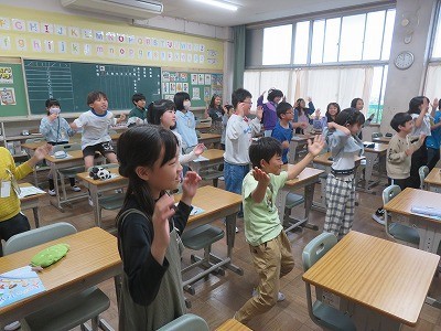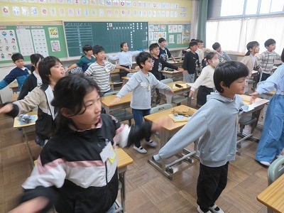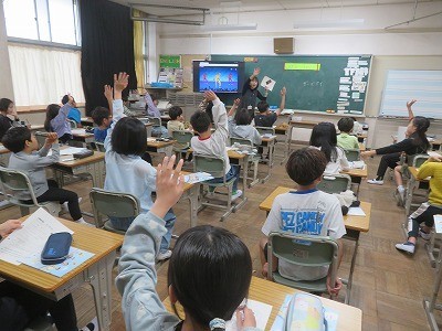 3・4年生の外国語活動が始まりました。今日は、ガイダンスです。4年生は、アルファベットを体で表現して歌ったり、「What's do you like?」の答えを自己紹介カードに書いたりしました。授業の終わりには、「今月の英語の歌」の発表もあり、次の授業も楽しみになりました。