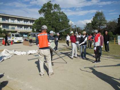 テント張り、入退場門のポールの設置、ロープ張り、放送設備の設置等、それぞれが分担をしながら準備を行いました。