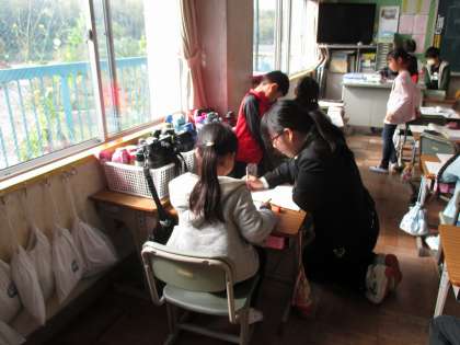 今日の2年1組の2時間目は国語の時間で、「お話しのさくしゃになろう」とのテーマで子どもたちは、お話しを考えて書いたり、挿絵を書いたりしていました。今日は大学生4年生のボランティアの先生にもお手伝いをしていただきました。この学生ボランティアの先生は教員採用試験に合格しており、来年春から正式に小学校の教員になることが内定している方です。