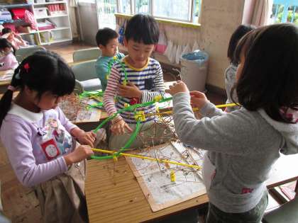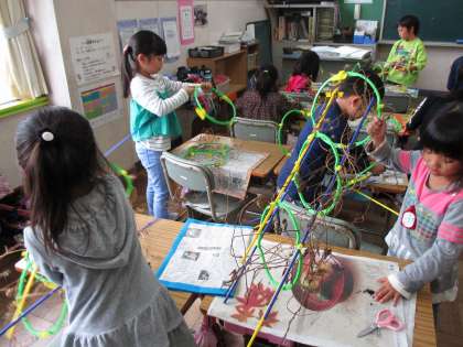 今日の1年1組の2・3時間目は生活科の時間で、藤江っ子まつりで展示するリースを作っていました。