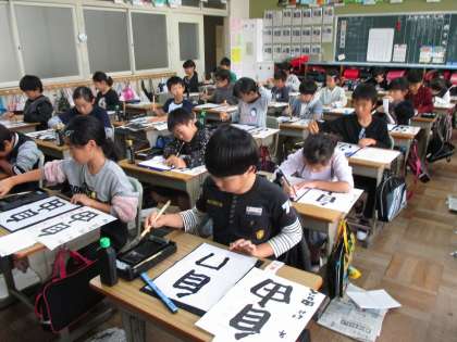今日の4年2組の4時間目は書写の時間で、「自由」という文字を書いていました。