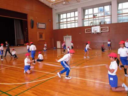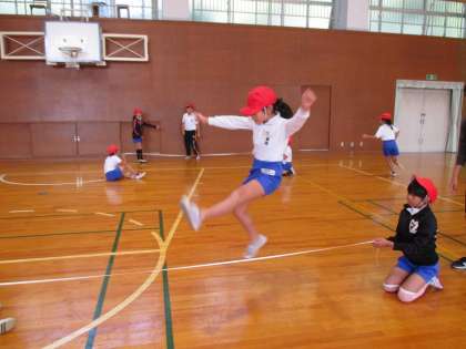 今日の4年2組の4時間目は体育の時間で、体育館においてゴム跳びの練習をしていました。この練習を経て高跳びの練習へとつなげていきます。