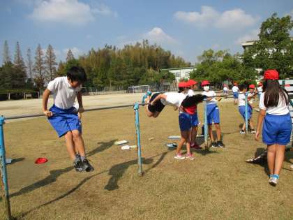 今日の5年生の3・4時間目は体育の時間で、鉄棒で逆上がりの練習をしていました。