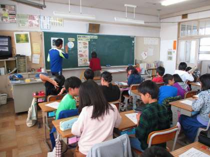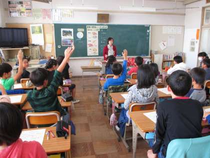 今日の5年2組の4時間目は食育の時間で、今週月曜日の1組と同様、東浦町の栄養教諭の先生が来校し、「給食の材料はどこからきたの」とのテーマで食糧自給率や国産材料などを取り上げながら授業を行っていました。