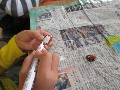 1年1組は2・3時間目、2組は1・2時間目に藤江っ子まつりの準備を行いました。2組では集めたドングリに小さな顔を器用に描いて、どんぐり人形を作っていました。