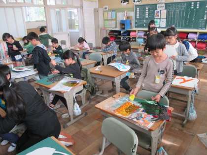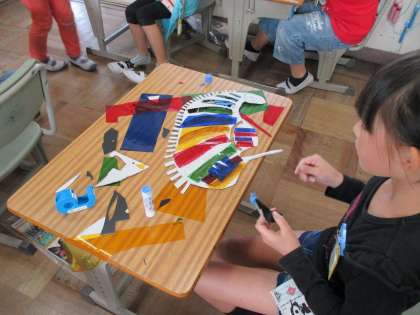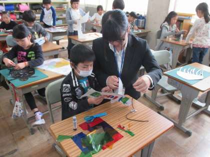 今日の2年1組の3・4時間目は図工の時間で、「ひかりのプレゼント」を作っていました。この授業には学生ボランティアの先生にお手伝いをしていただきました。