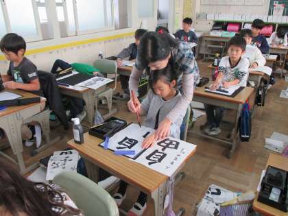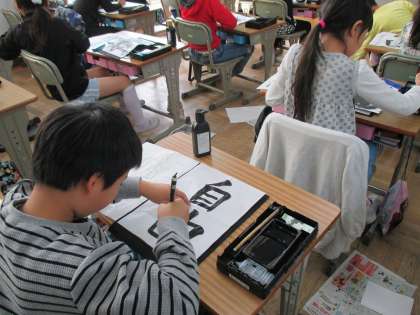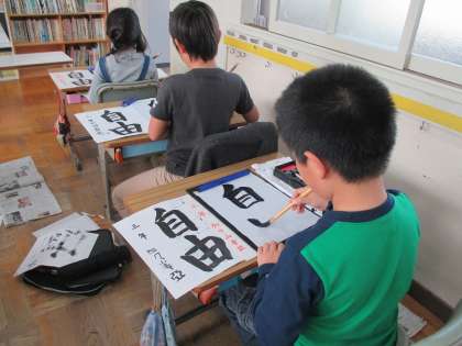 今日の3年1組の2時間目は書写の時間で、「自由」という文字を書いていました。