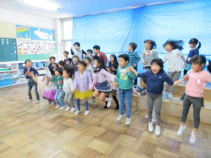 今日の1年1組の5時間目は「くじらぐも」の劇の中で、「天までとどけ、いちにーさん」のかけ声とともにタイミングを合わせて、みんなでジャンプする練習を繰り返していました。本番で上手くできるといいです。