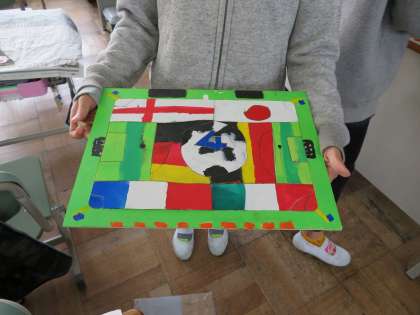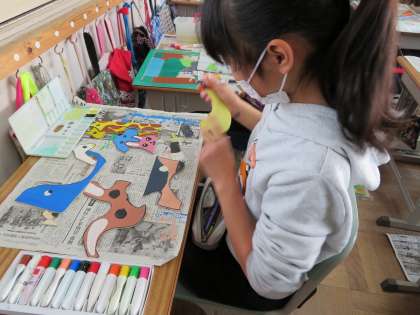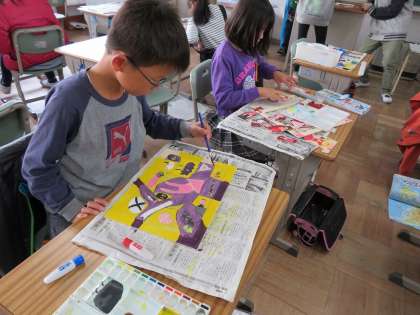 今日の5年1組の1・2時間目は図工の時間で、「くねくね糸のこパズル」の制作の続きを行っていました。すでに完成した子どももいるようです。