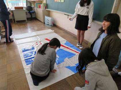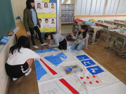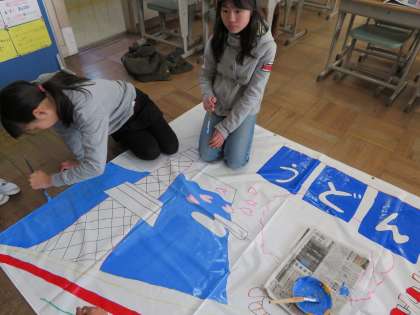 本校は「アートマイル国際交流壁画共同制作プロジェクト」に参加しています。アートマイルは、世界の同世代とグローバルなテーマで協働的に学び合う国際協働学習です。今日の授業後に6年生の実行委員の子どもたちがが絵画の作成を行いました。完成した絵画はアートマイルの相手校である台湾の台北市立太平小学校へ送られます。そして、残りの部分を完成し、卒業式には披露される予定です。