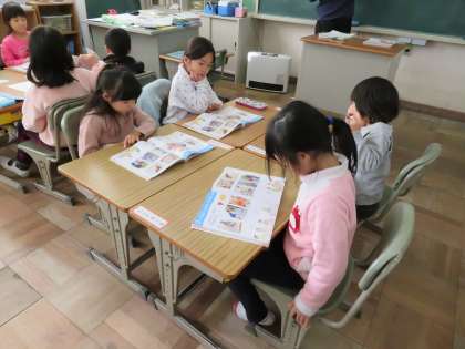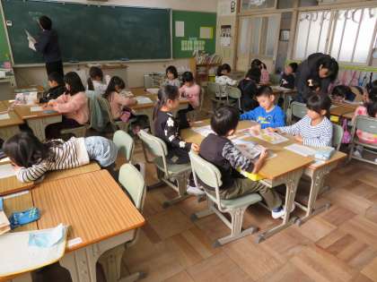 今日の1年2組の4時間目は生活科の時間で、「じぶんでできることをしよう」という単元の授業でした。家族の人にしてもらっている仕事を思い起こし、自分できることには何があるかを考える内容の授業でした。