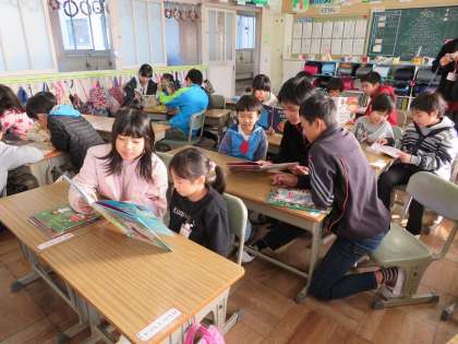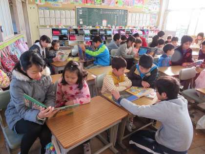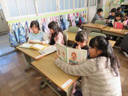 今日の読書タイムの時間は、1学期に続いてペア読書を行いました。4年生から6年生までの子どもたちが、1年生から3年生までの自分のペアの子どもに読み聞かせをする活動です。下の写真は1・6年生のペア読書の様子です。