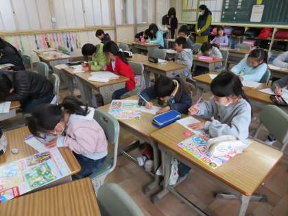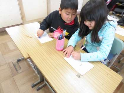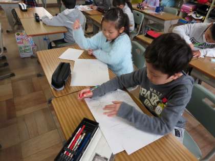 今日の2年1組の3・4時間目は図工の時間で、「たのしく うつして」という単元の授業で版画の下絵を描いていました。