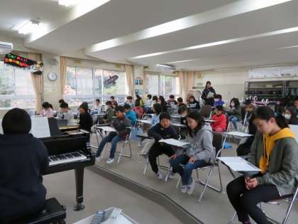今日の4年1組の3時間目は音楽の時間で、ピアノの伴奏に合わせて「心の中にきらめいて」という曲を歌っていました。