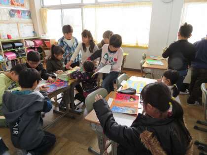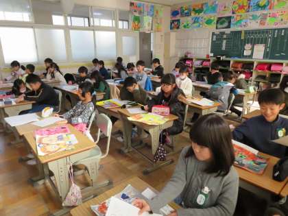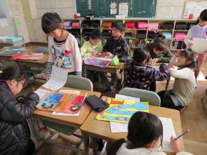 今日の3年1組の3時間目は図工の時間で、「うれしかったあの気持ち」というテーマで冬休みに宿題として描いた絵をみんなで鑑賞し合い、その感想をプリントに記入していました。