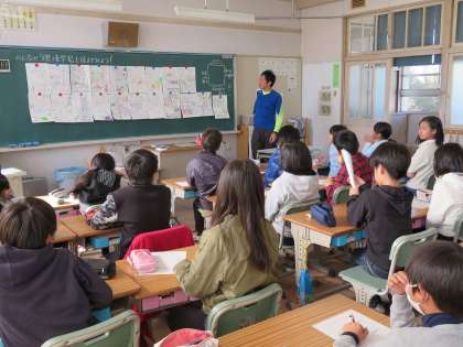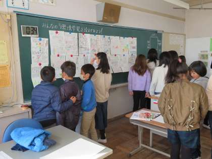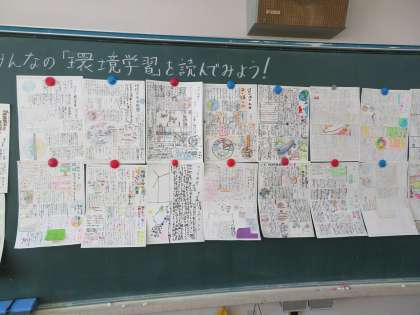 今日の5年1組の5時間目は総合的な学習の時間で、これまでの環境学習で学んだり調べたりして各自でまとめたものをみんなで読み合っていました。