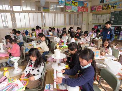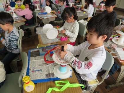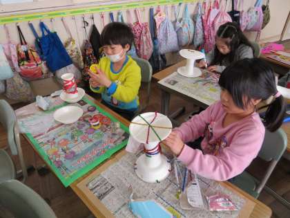 今日の1年1組の2時間目は図工の時間で「コロコロ ゆらりん」という単元で、紙コップ等を使った動くおもちゃを作っていました。